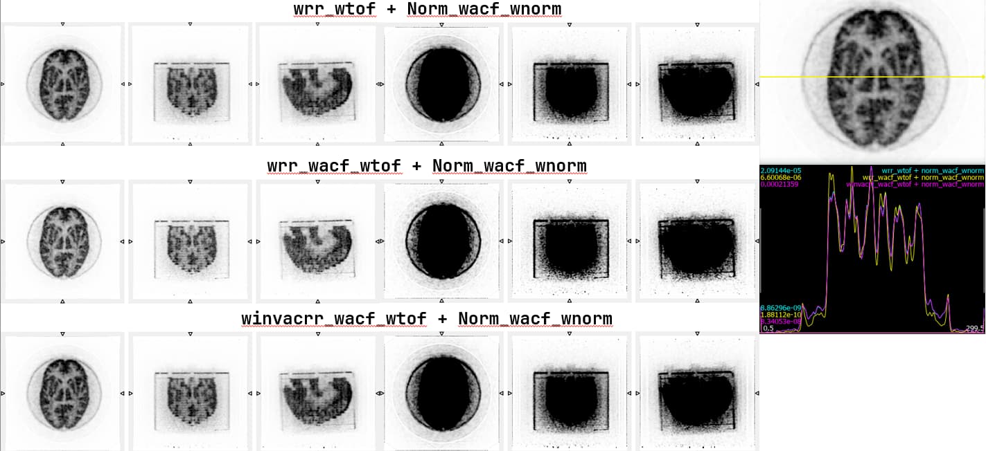 The events num and colorbar of image is totally the same, but reconstruction with setting 4 show that the central region of the cylinder is lower than expected. I suspect it might be because my scatter rate is being additionally attenuation-corrected once more inside CASToR, so I tried dividing the scatter correction factor by the attenuation correction factor before reconstruction (CDF_wtof_winvacscf_wacf + Norm_wacf) and obtained results similar to those from other settings.